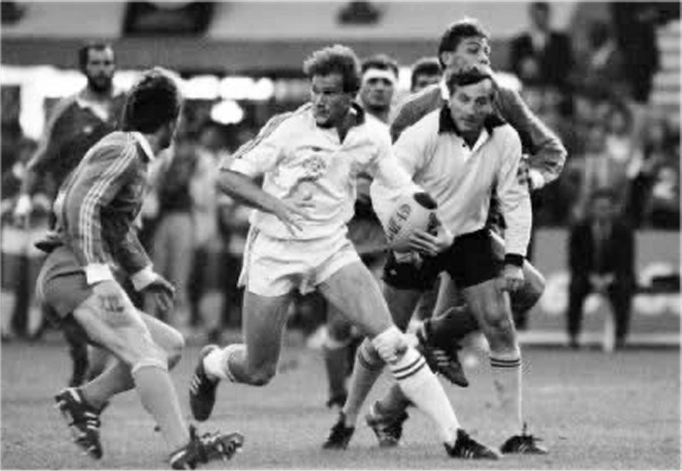 1987-1988 - Philippe Sella s'apprête à plaquer l'arbitre, Monsieur Lamoulie, lors de la finale du championnat de France opposant l'équipe première du Stadoceste Tarbais et celle d'Agen. |